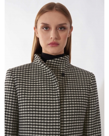 Stehkragen Mantel mit Pied-de-Poule-Muster aus reiner Wolle in Schwarz
