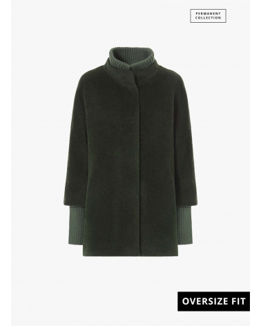 Short oversized green alpaca and wool coat with knitted details