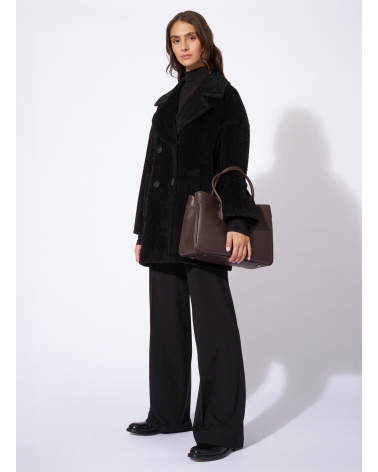 Short oversized black double breasted wool and alpaca coat