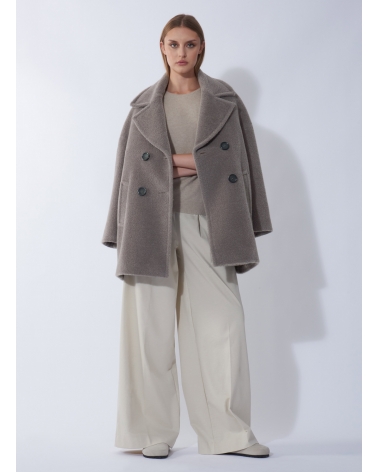 Short oversized dark taupe double breasted wool and alpaca coat