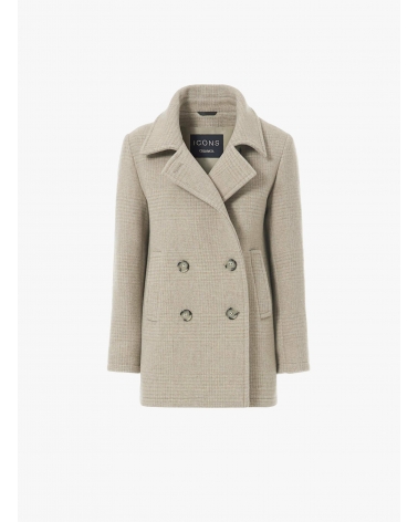 Beige double breasted peacoat with micro houndstooth pattern