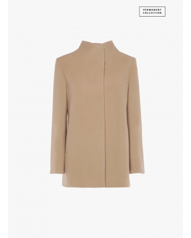 Short light camel wool and cashmere coat with high stand up collar