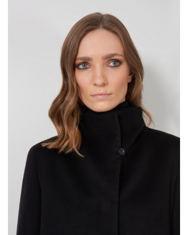 Flared black pure cashmere coat with high stand up collar