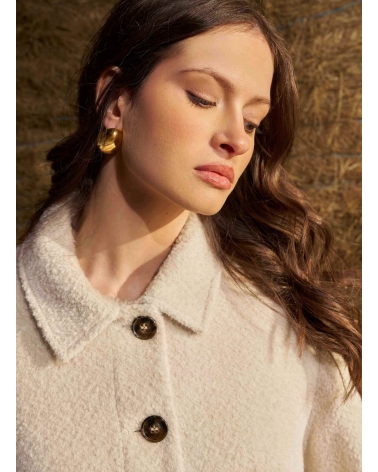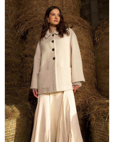 Cappotto corto beige in lana e alpaca con collo a camicia e tasche applicate