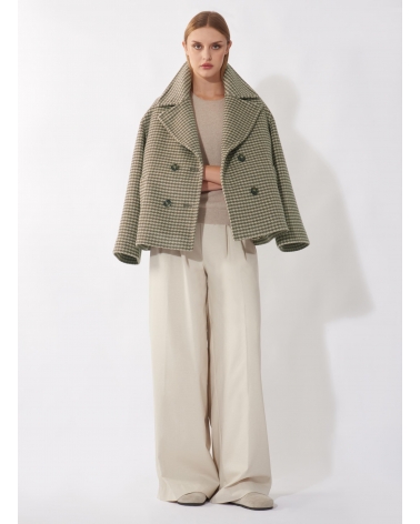 Cappotto corto doppio petto oversize taupe scuro in pura lana con fantasia pied de poule