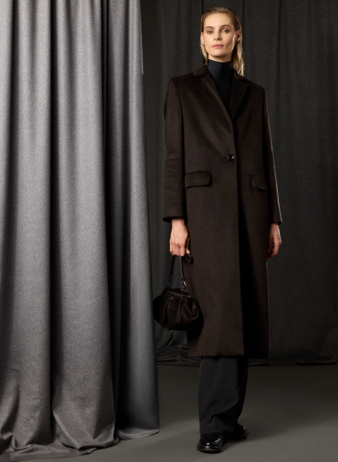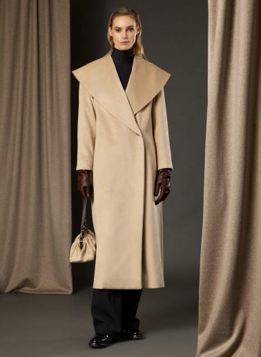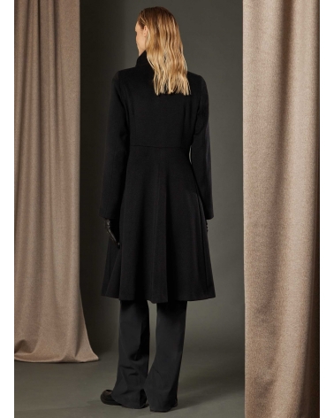Cappotto redingote lungo nero con collo alto drappeggiato in pura seta