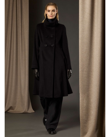 Langer Redingote-Mantel mit hohem und drapiertem Kragen aus reiner Seide in Schwarz