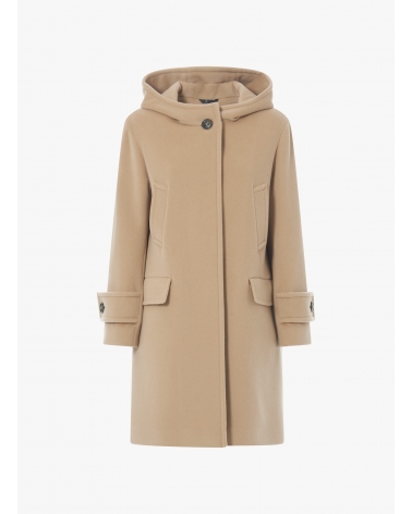 Hooded light camel wool and cashmere parka with double pockets