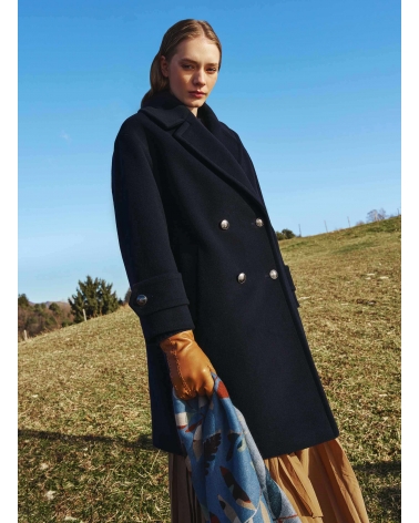 Blue double breasted wool and cashmere coat with metal buttons with logo