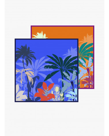Double face blue twill silk scarf with tropical pattern