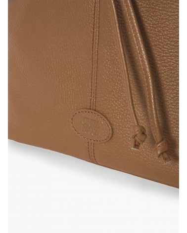 Tobacco color genuine leather bucket bag with gusset and logo