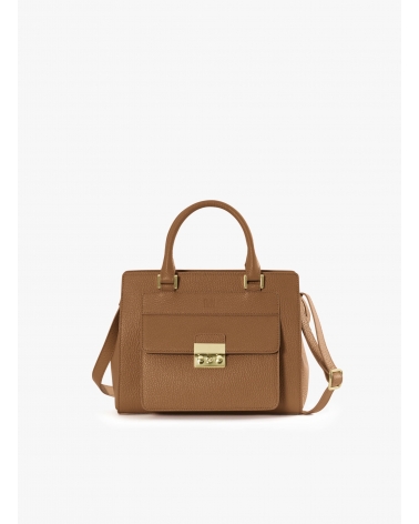 Borsa rigida in pelle color tabacco con chiusura in metallo