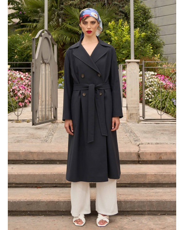 Maxi trench blu doppio petto in tessuto tecnico antigoccia