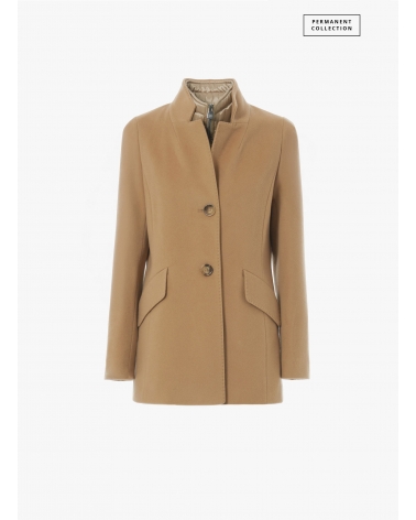 Cappotto corto cammello in pura lana con pettorina in nylon staccabile