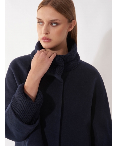 Cappotto corto blu in lana e cashmere con inserti in maglia a coste