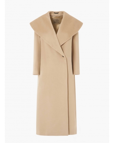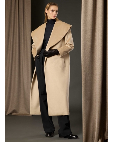 Cappotto beige con collo a maxi scialle in pura seta