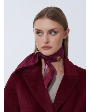 Small purple pure silk twill scarf with stylized feather pattern