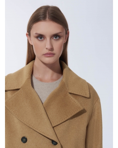 Short double breasted pure camel wool camel coat with maxi notch collar