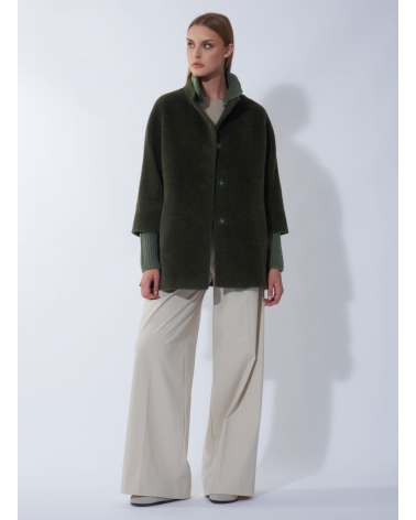 Short oversized green alpaca and wool coat with knitted details
