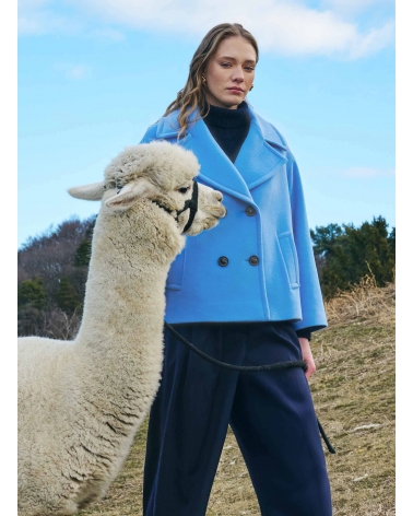 Short oversized light blue coat in pure wool with maxi notch collar