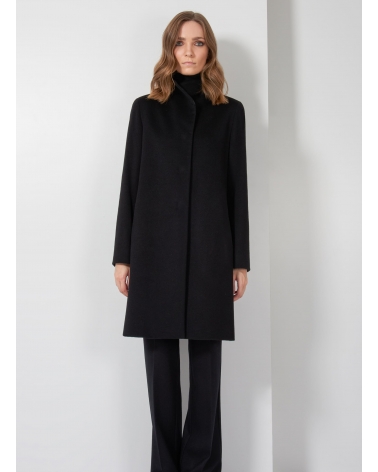 Flared black pure cashmere coat with high stand up collar