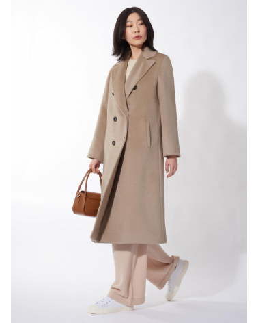 Длинное двубортное бежевое пальто на 6 пуговицах из шерсти и альпаки.