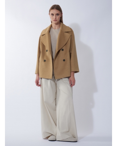 Короткое двубортное пальто верблюжьего цвета с макси-лацканами из чистой шерсти верблюжьего
