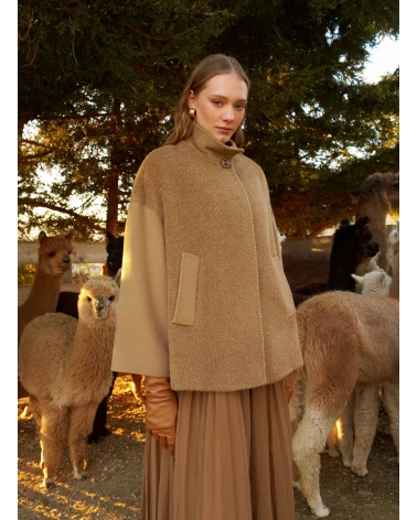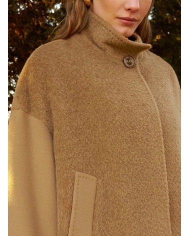 Short dark camel wool and alpaca coat with contrasting fabric texture
