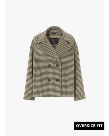 Short oversized dark taupe houndstooth coat in pure wool with maxi notch collar