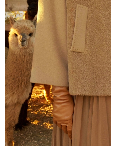 Short dark camel wool and alpaca coat with contrasting fabric texture