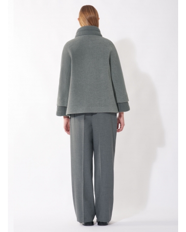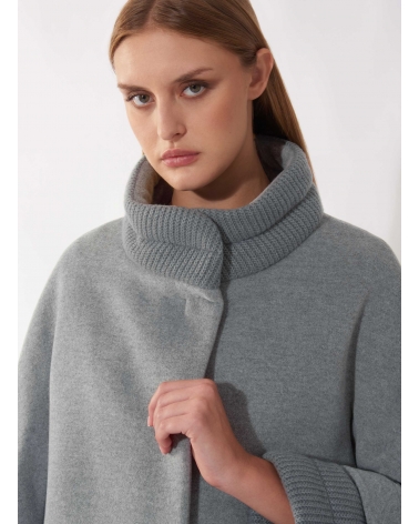 Short light grey wool and cashmere coat with ribbed knit inserts